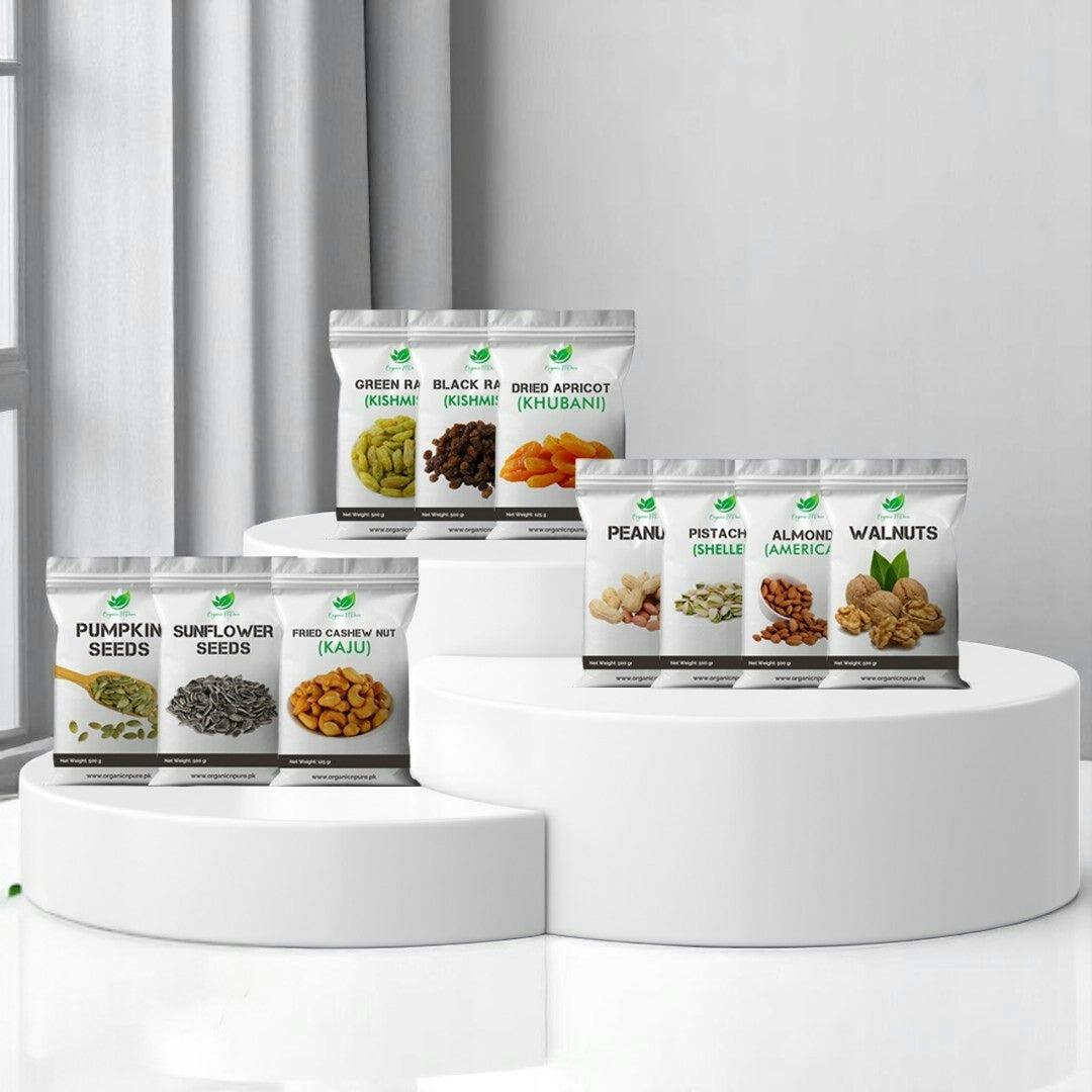Indulge in a nutritious mix of Fried Cashews, Peanuts, Pistachios Shelled, Almonds, Walnuts, Pumpkin Seeds, Sunflower Seeds, Green Raisins, Black Raisins, and Dried Apricots. Rich in protein, healthy fats, and essential nutrients, this bundle supports energy, heart health, and overall well-being. Buy the bundle for unbeatable value and a healthier lifestyle. Shop now.